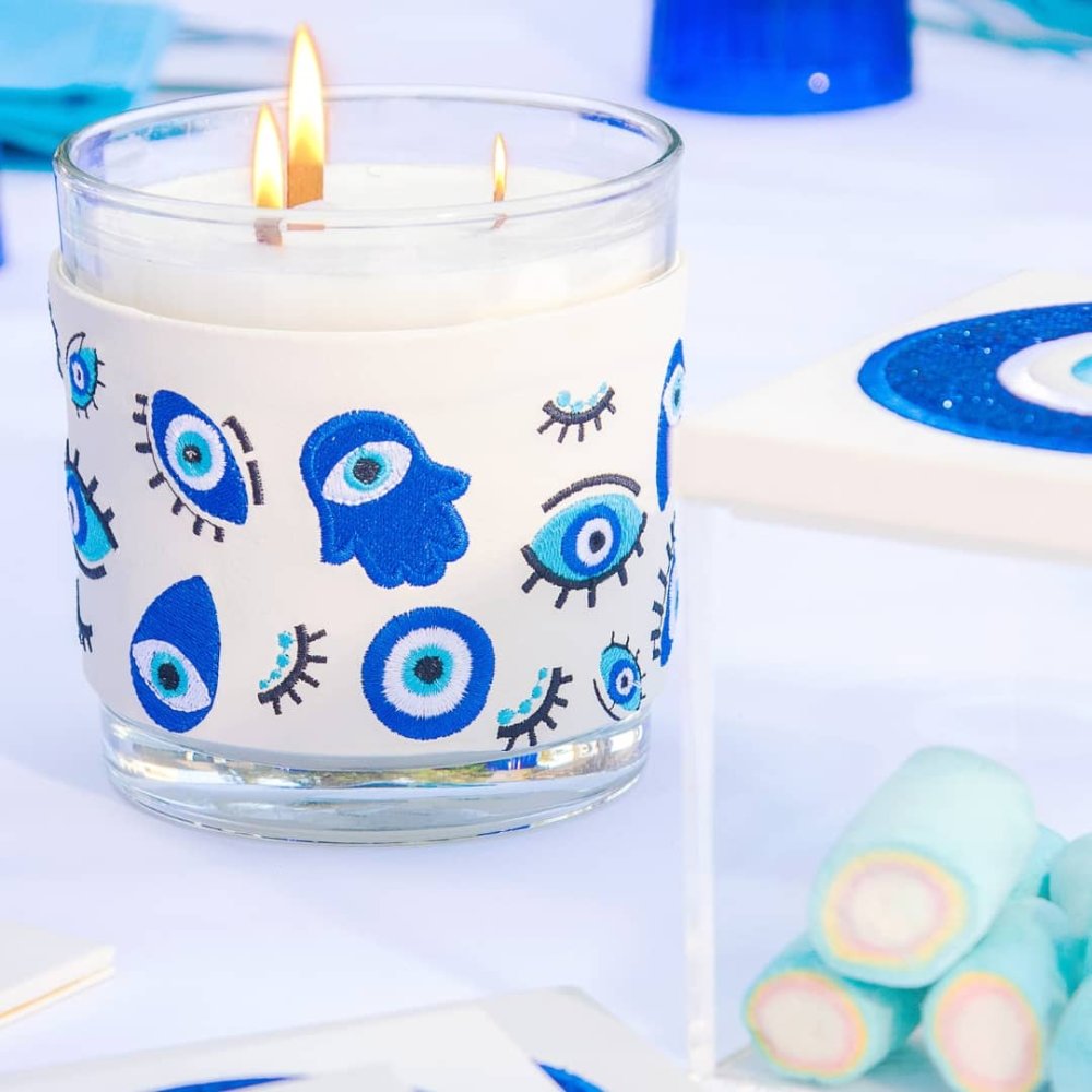 Strong scented candle with an abstract eye pattern embroidered ring.