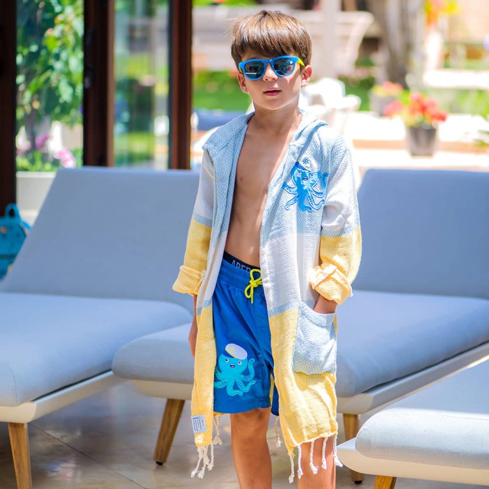 Blue swim shorts with a Sailor octopus design.