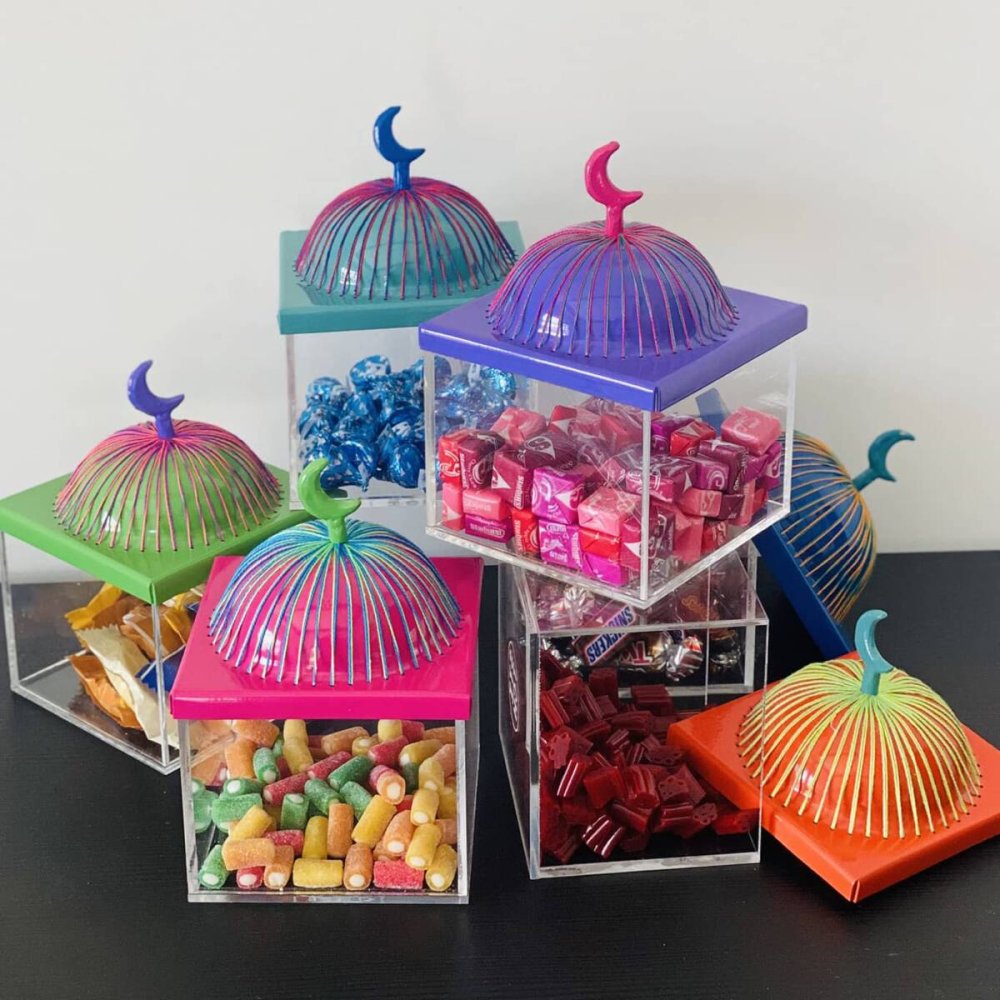 It doesn’t get more festive than our Ramadan themed aluminum dome box  with colored threads and a transparent acrylic base.
