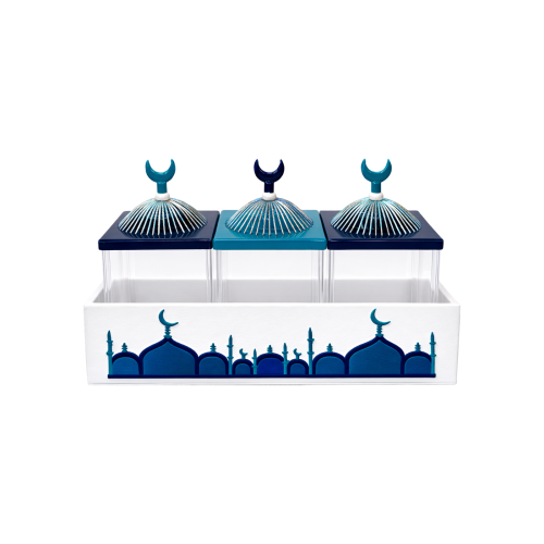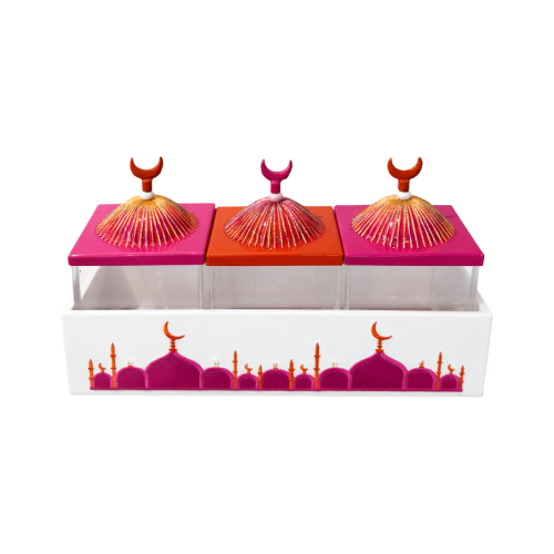 It doesn’t get more festive than our Ramadan themed aluminum dome box with colored threads and a transparent acrylic base.