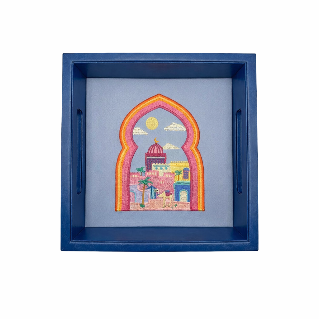 A decorative tray showcasing an intricately embroidered arch design inspired by Middle Eastern architecture, framed in deep blue. The detailed embroidery showcases a charming cityscape with domes, palm trees, and desert elements, creating a vibrant yet elegant focal point. Designed for both serving and display, this tray adds warmth, color, and artisanal character to any space.