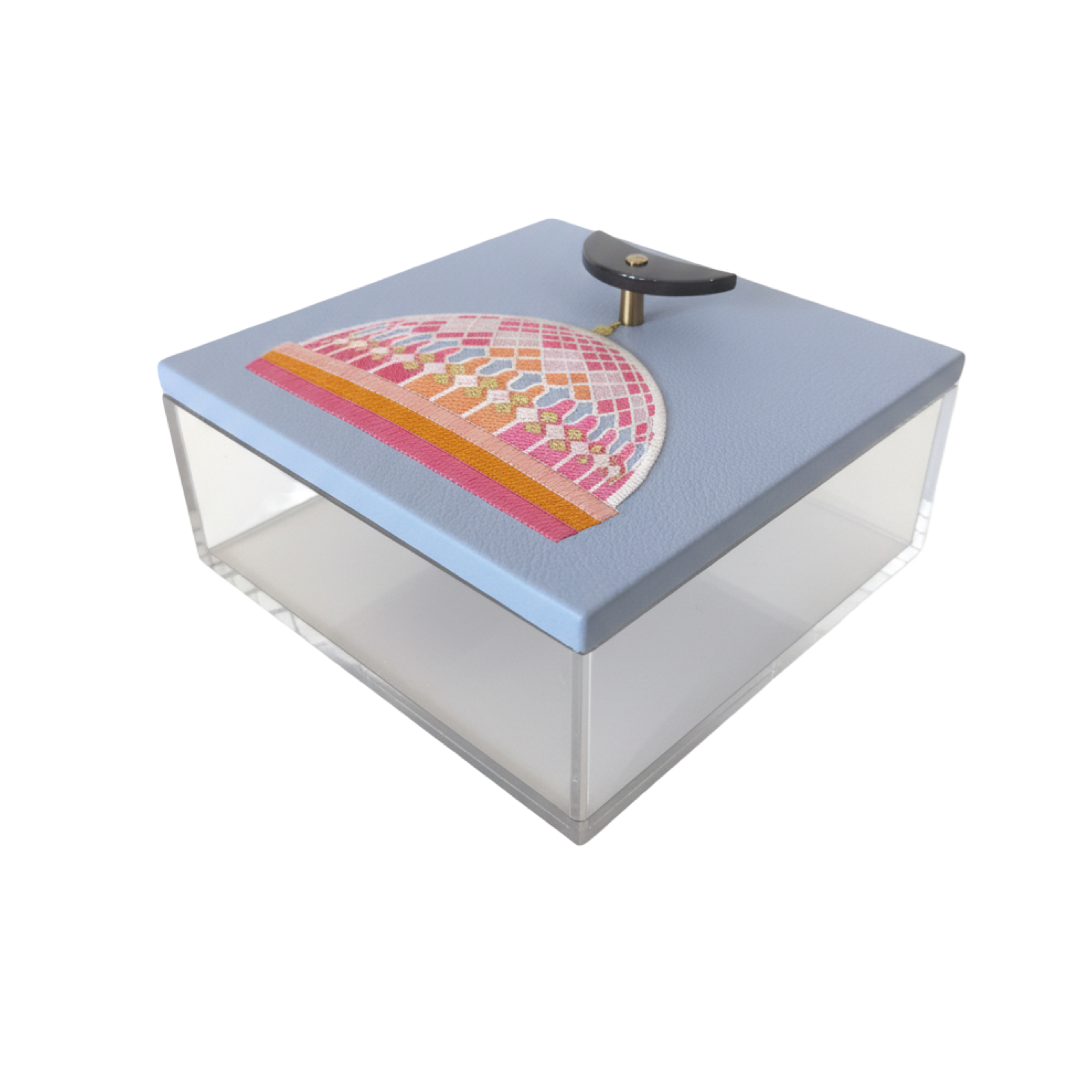 The box features an elegant acrylic base with a sleek, transparent design, giving it a modern and minimalist look. The cover is made of luxurious leather, offering a soft yet durable finish. The highlight of the cover is an intricate embroidered dome design, where rich shades of dark pink, light pink, and orange intertwine beautifully, creating a harmonious and eye-catching pattern. The design is outlined with a delicate white thread that enhances the contrast and gives it a refined finish. At the top, the box is adorned with a moon-shaped marble handle, symbolizing the beauty of the Ramadan season. The handle has a soft, polished texture, with subtle veins running through the marble, adding an elegant touch to the overall design. This unique and thoughtful design makes it a perfect decorative and functional piece for the holy month of Ramadan.