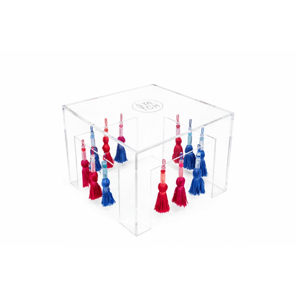A clear acrylic display stand adorned with handcrafted tassels in soft pink, blush, and blue tones. Designed to showcase decorative charms, accessories, or keepsakes, this stand combines gentle color with a modern, transparent structure. The result is a light, elegant piece that adds warmth and movement while blending seamlessly into curated interiors.