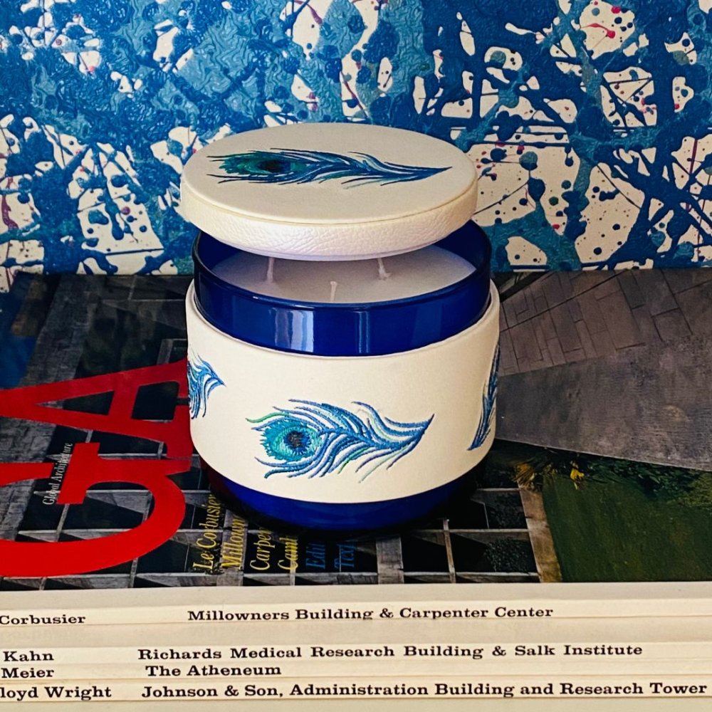 Beautiful Fragranced candle with a embroidered feather design.