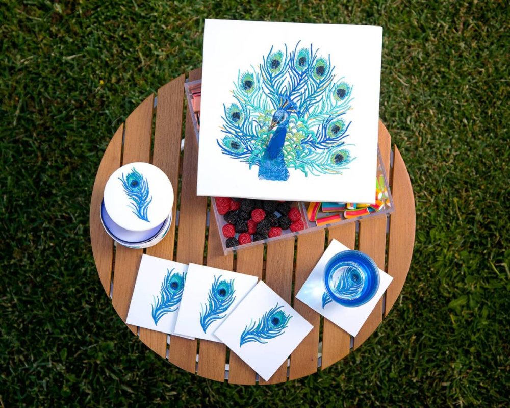 pretty peacock on a white leather cover for acrylic box with a divided base. 27x 27 cm Acrylic base divided into 4 sections.