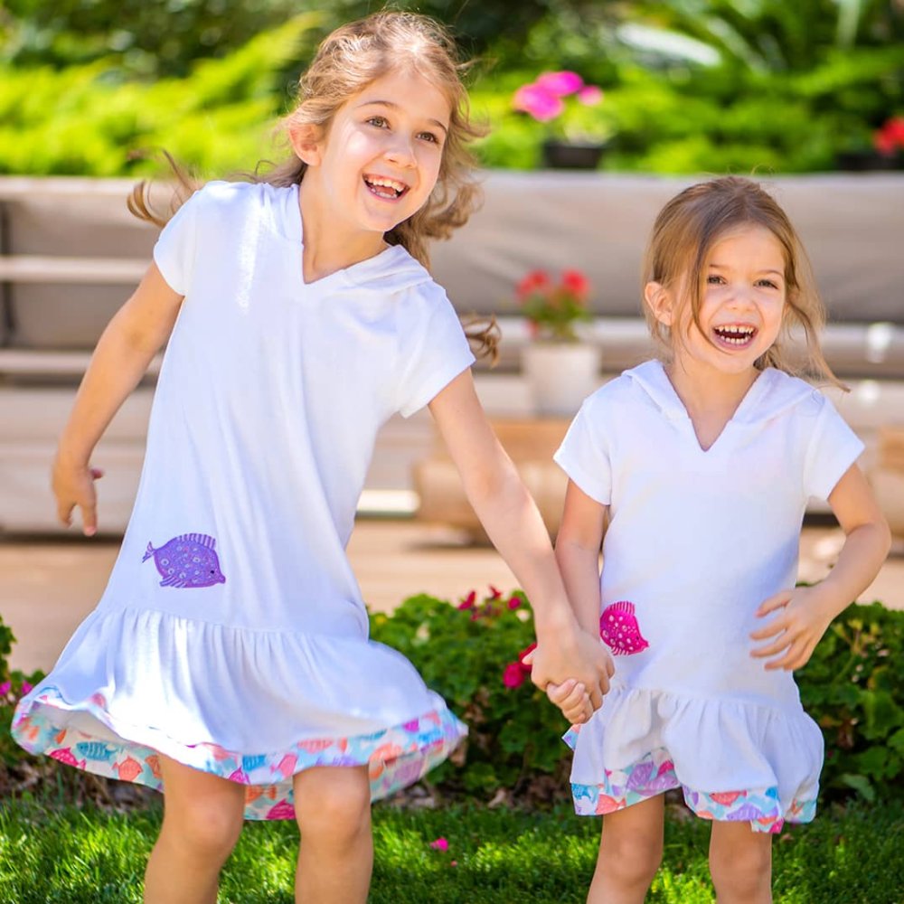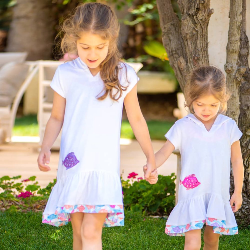 Dry them off after they dip in this white towel coverup. featuring a cute appliqué pink fish design and a beautiful printed trim. A great beach or pool coverup to personalize with your little ones initials or name.