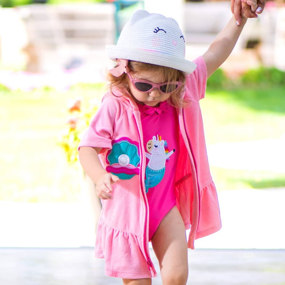 Hot pink towel coverup with an oyster embroidered design. Perfect to use after swimming.