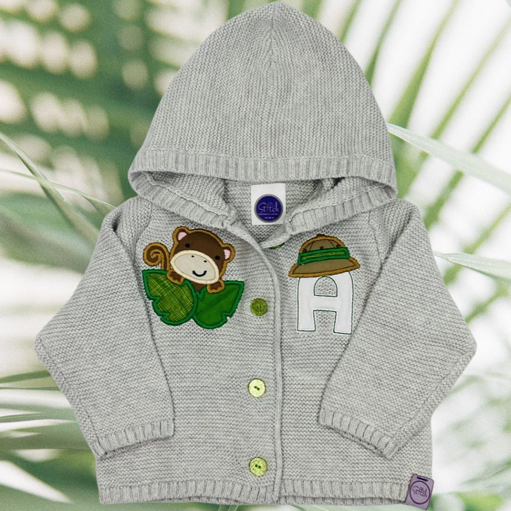 Grey knitted Hoodie, safari theme monkey, choose first name letter to add next to the monkey on the other side.Stitch JoStitch Jo InstagramStitch Jo Facebook