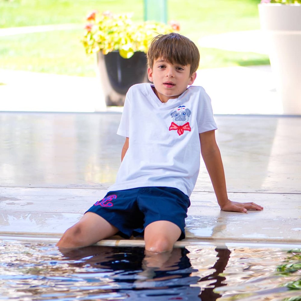 The navy shorts are embroidered with an anchor design and the white t-shirt has a cute sailor dog design.