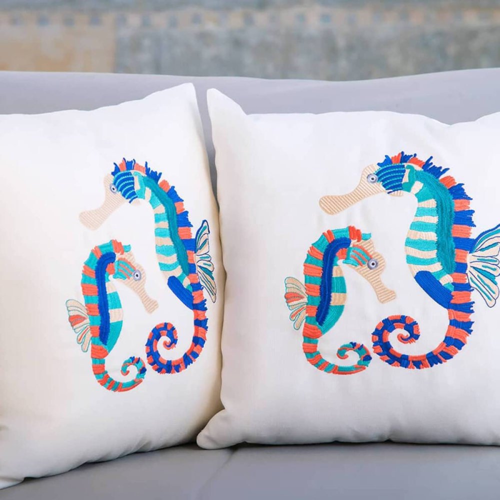 Vibrant & colorful embroidered Sea horse cushion.