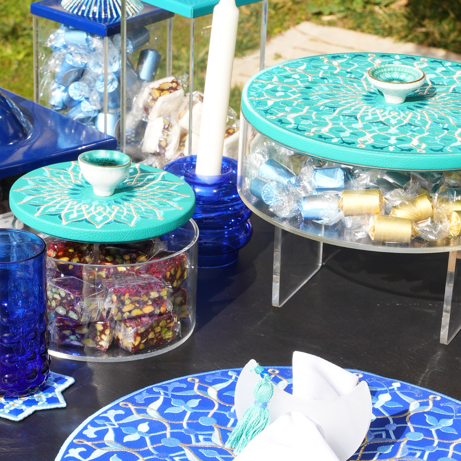 Inspired by classic Arabesque motifs, this box is adorned with intricate embroidery in soft turquoise hues, creating a calm and balanced aesthetic. Featuring a ceramic handle and a clear acrylic base, this mini box is perfect for Ramadan favors, sweets, or decorative accents, adding a fresh yet timeless touch.
