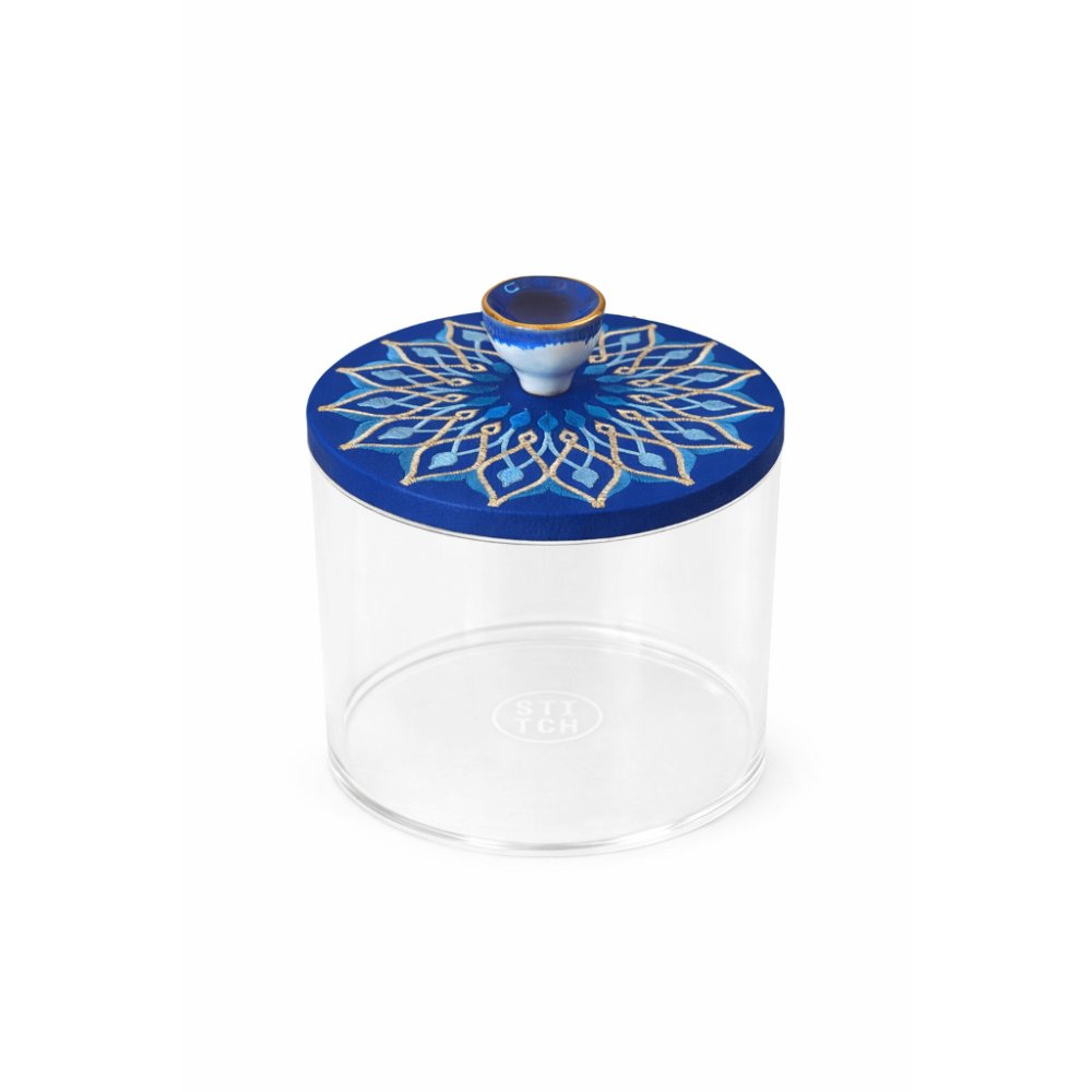 Inspired by the serenity of Ramadan nights, this box features refined arabesque embroidery in deep royal blue tones with subtle detailing. Finished with a ceramic handle and a clear acrylic base, this compact box is ideal for presenting dates, sweets, or small keepsakes, offering understated elegance in a smaller form.