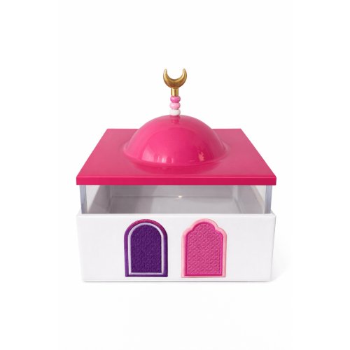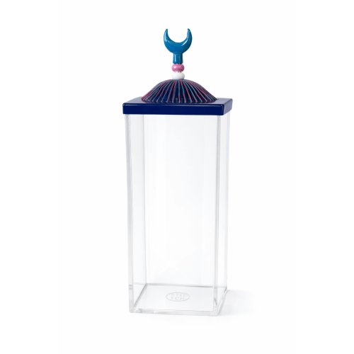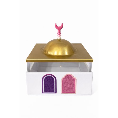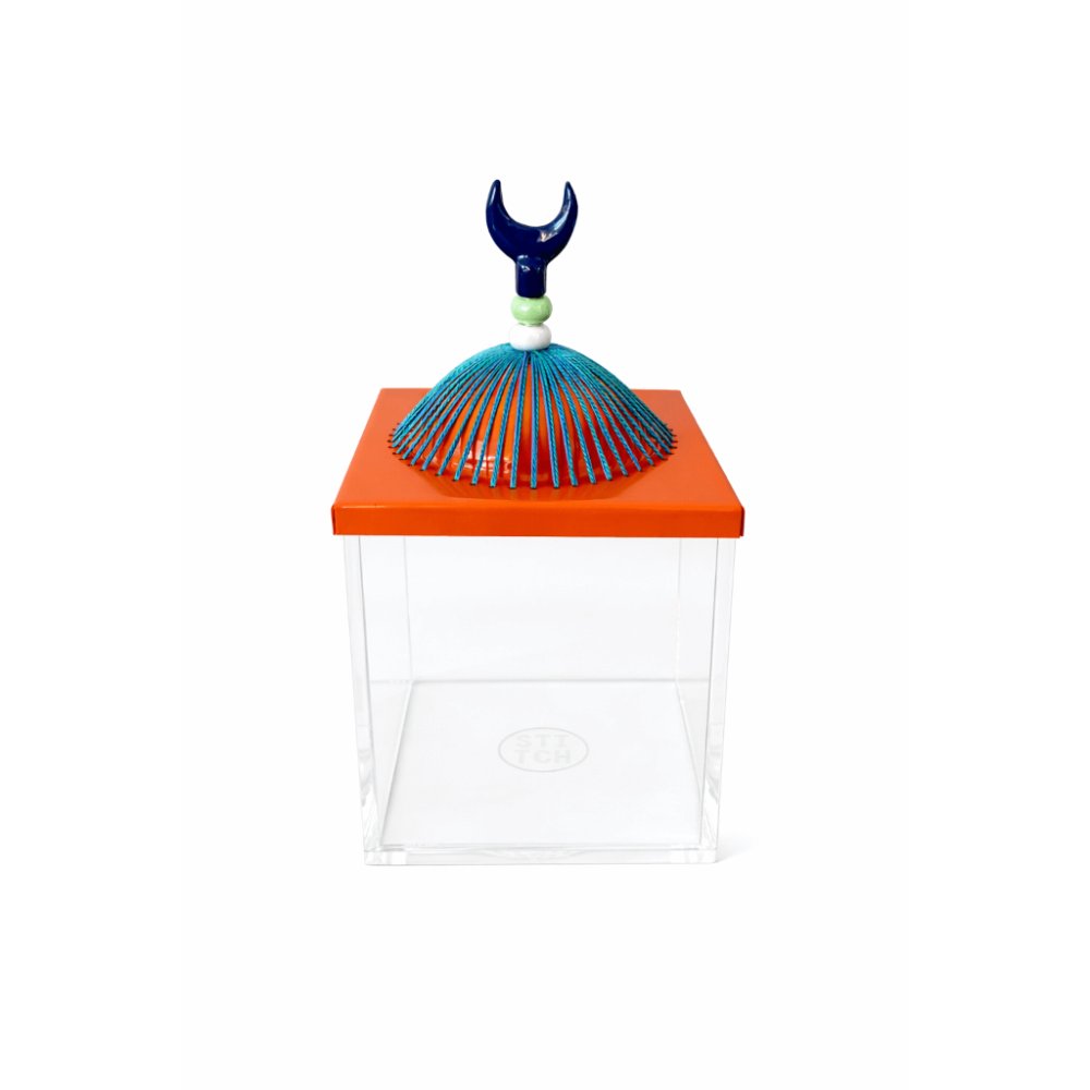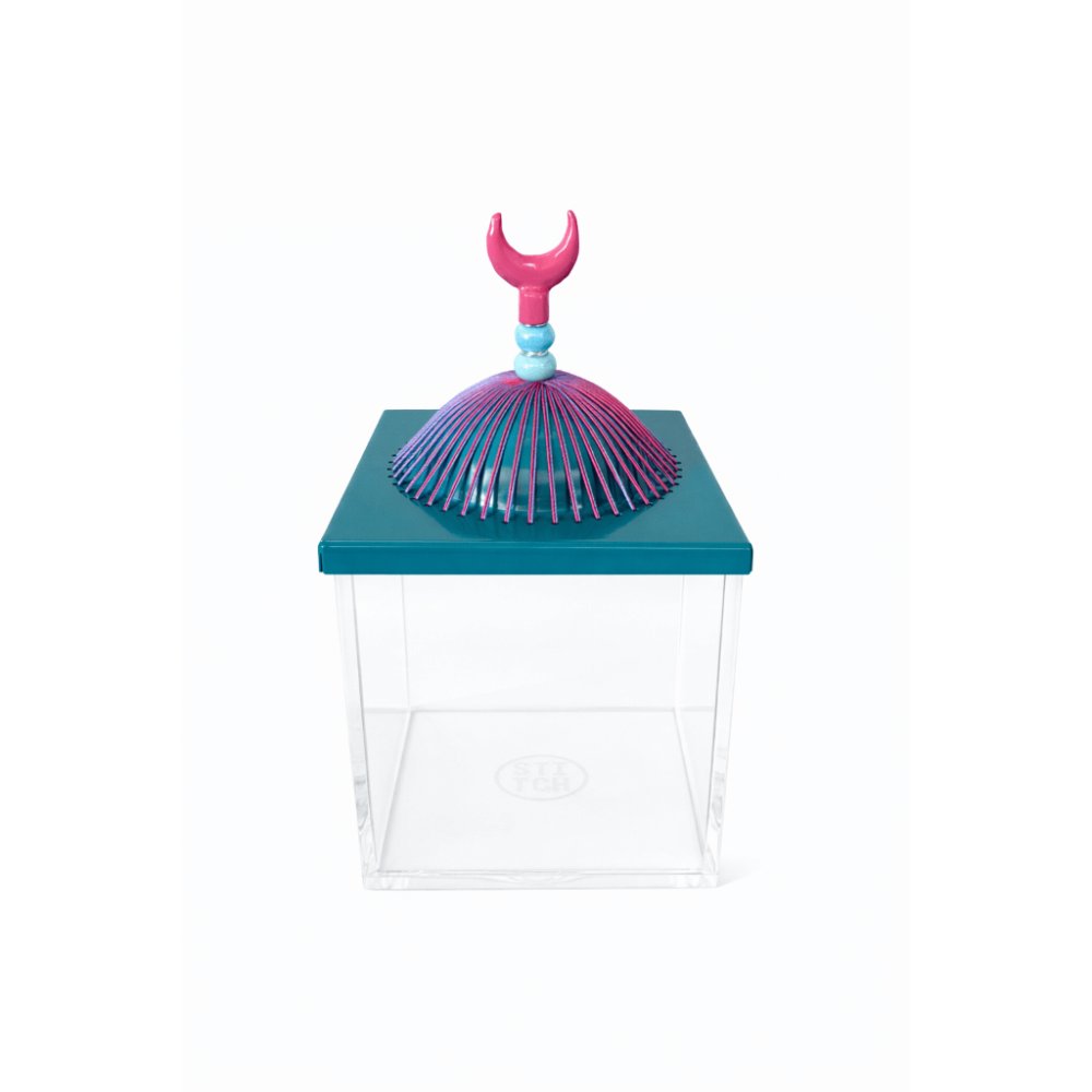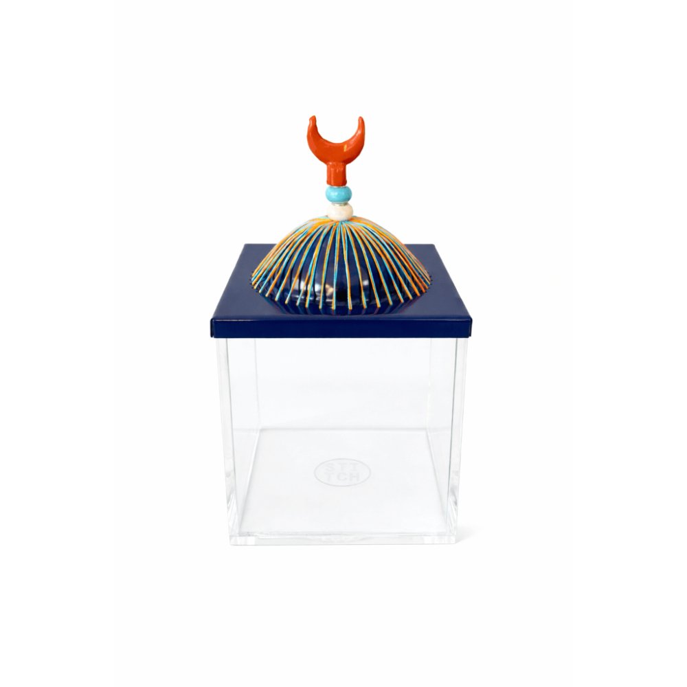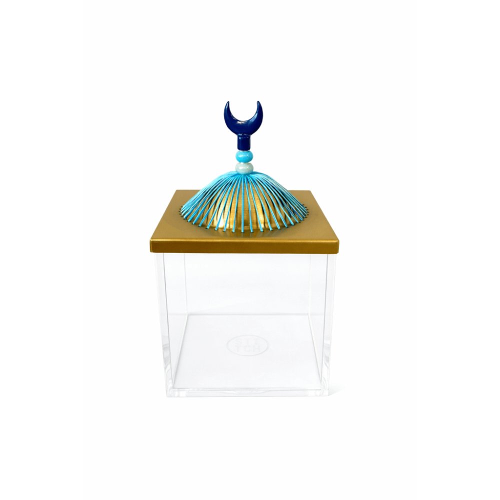 A clear acrylic box topped with a dome featuring embroidered threads and hand-placed beads, finished with a crescent detail. Designed to add a refined touch to Ramadan displays.