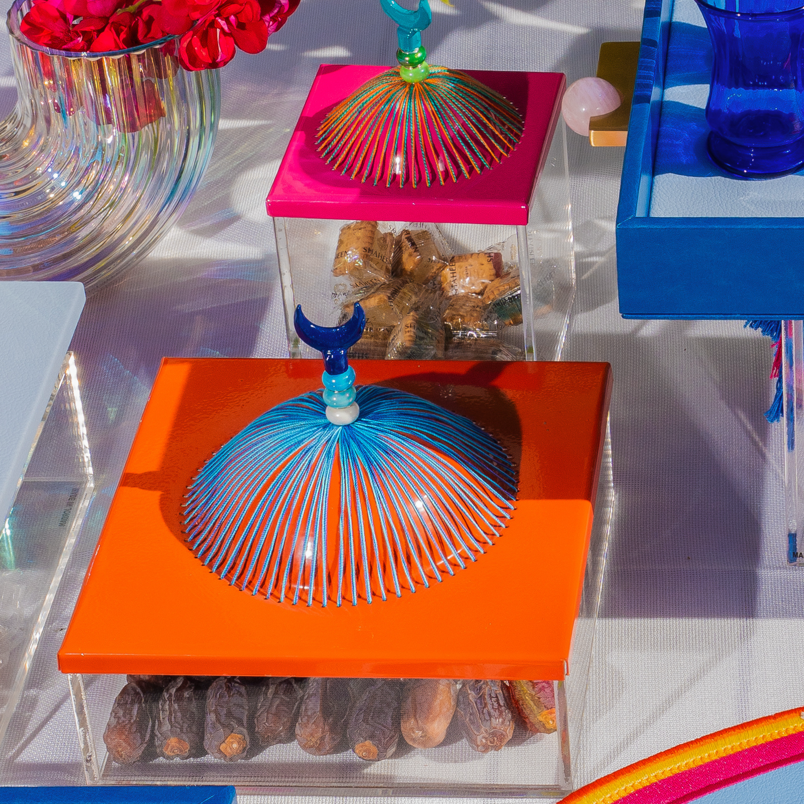 A clear acrylic box topped with a dome featuring embroidered threads and hand-placed beads, finished with a crescent detail. Designed to add a refined touch to Ramadan displays.